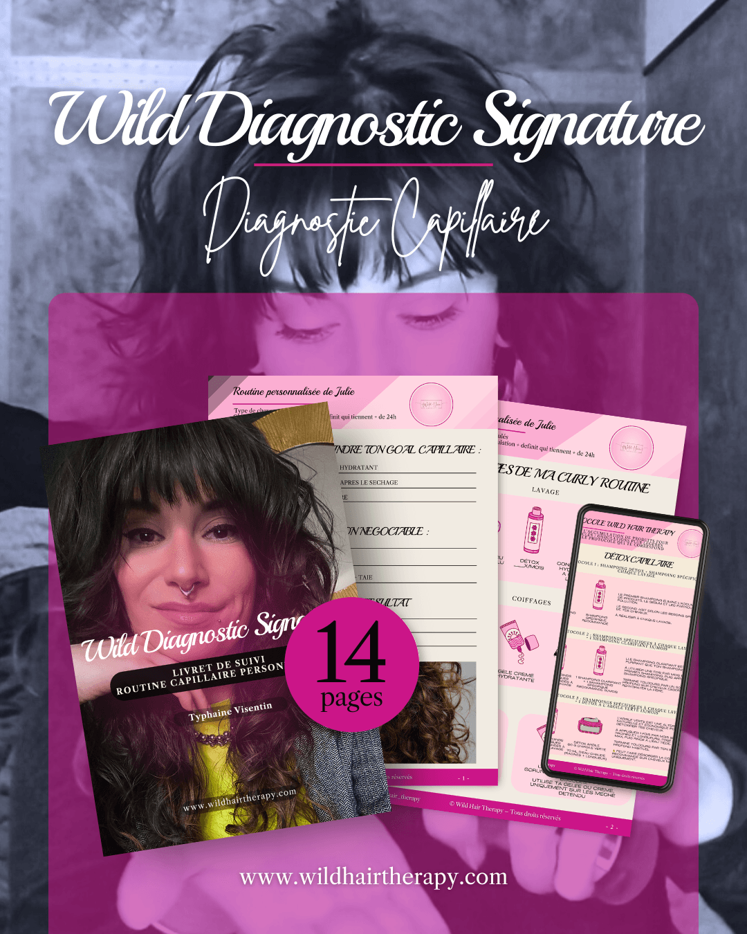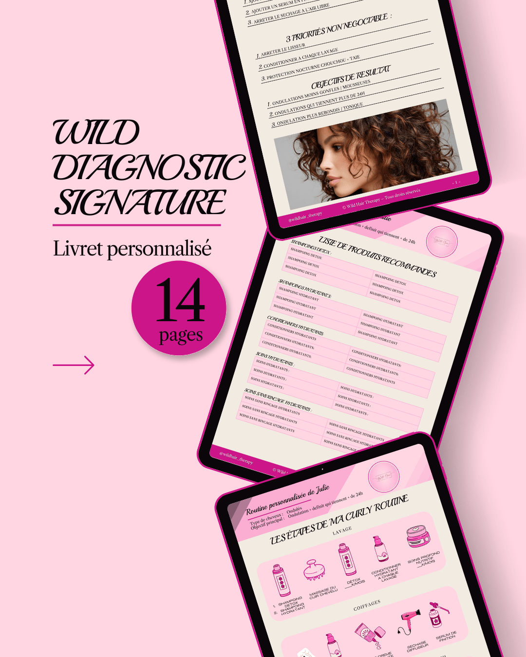 ta routine sous forme de plan visuel, ta sélection de produits et accessoires adaptés et les protocoles clés de la méthode Wild Hair Therapy pour sublimer durablement tes boucles ou ondulations.
